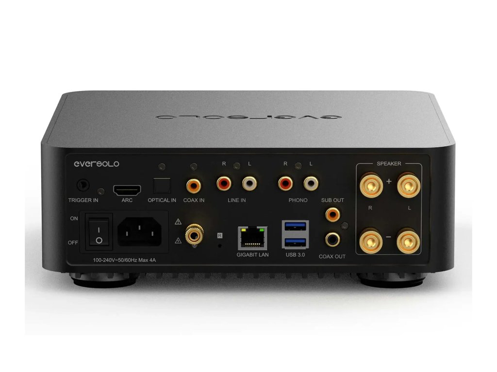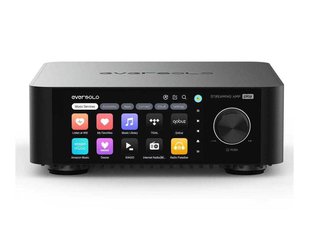 EverSolo Play je streamovací audio systém se zesilovačem třídy D (2x 110 W RMS při 4Ω) s DAC (D/A převodník AK4493SEQ). Streamuje z TIDAL, Qobuz, Spotify i NAS. HDMI ARC, PHONO, USB Audio Out. Vše v jednom přístroji kombinuje prémiový DAC, zesilovač třídy D a streamer hudby s vysokým rozlišením, 5,5palcový HD displej s novým uživatelským rozhraním, multiroom systém bezproblémově propojuje více zařízení. Je vybaven komplexními možnostmi připojení, možností ovládání různých regálových reproduktorů.